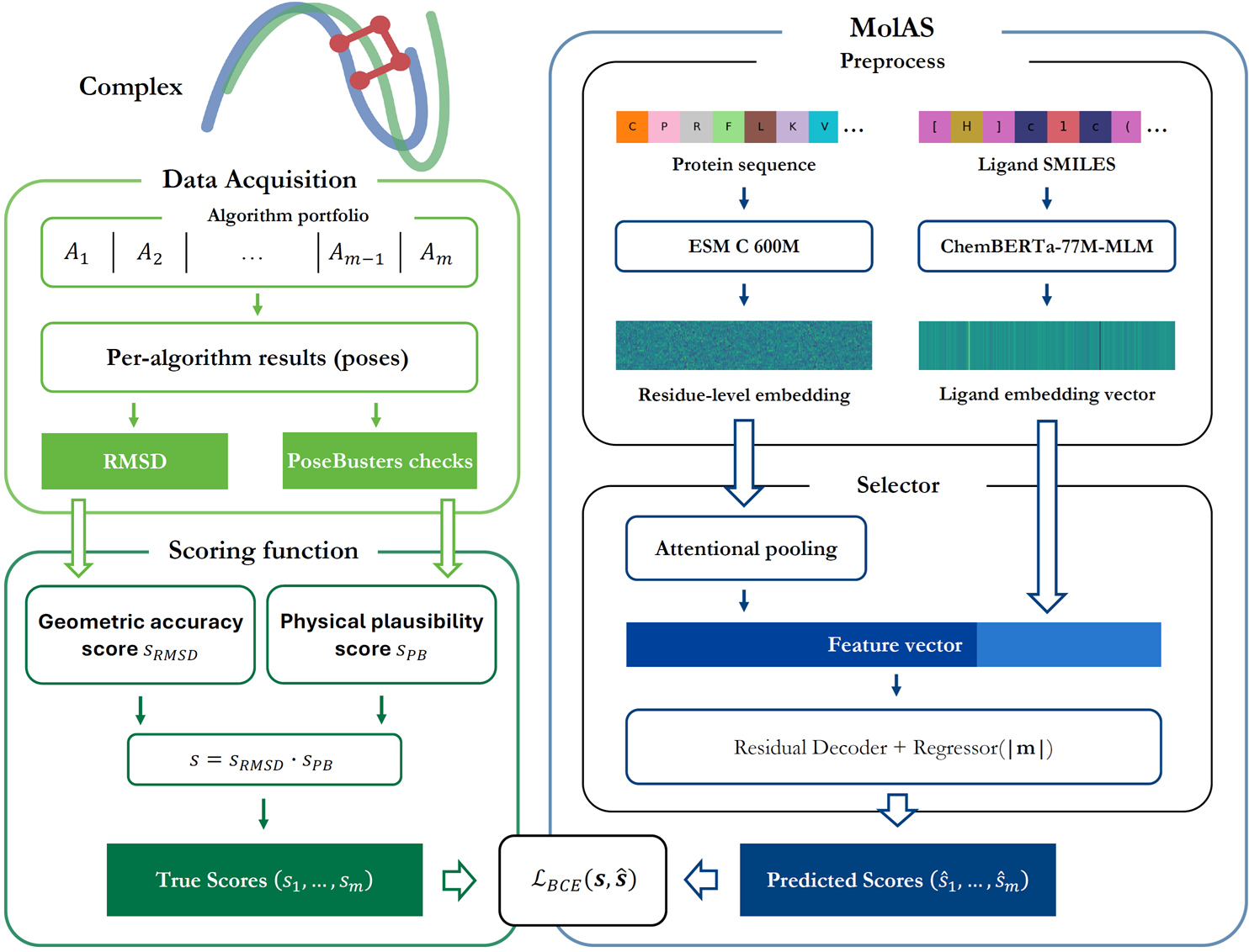 MolAS: Molecular Embedding-Based Algorithm Selection in Protein-Ligand Docking is a lightweight docking algorithm selector that predicts per-algorithm performance from pretrained protein-ligand embeddings using an attentional pooling and shallow residual decoder architecture.